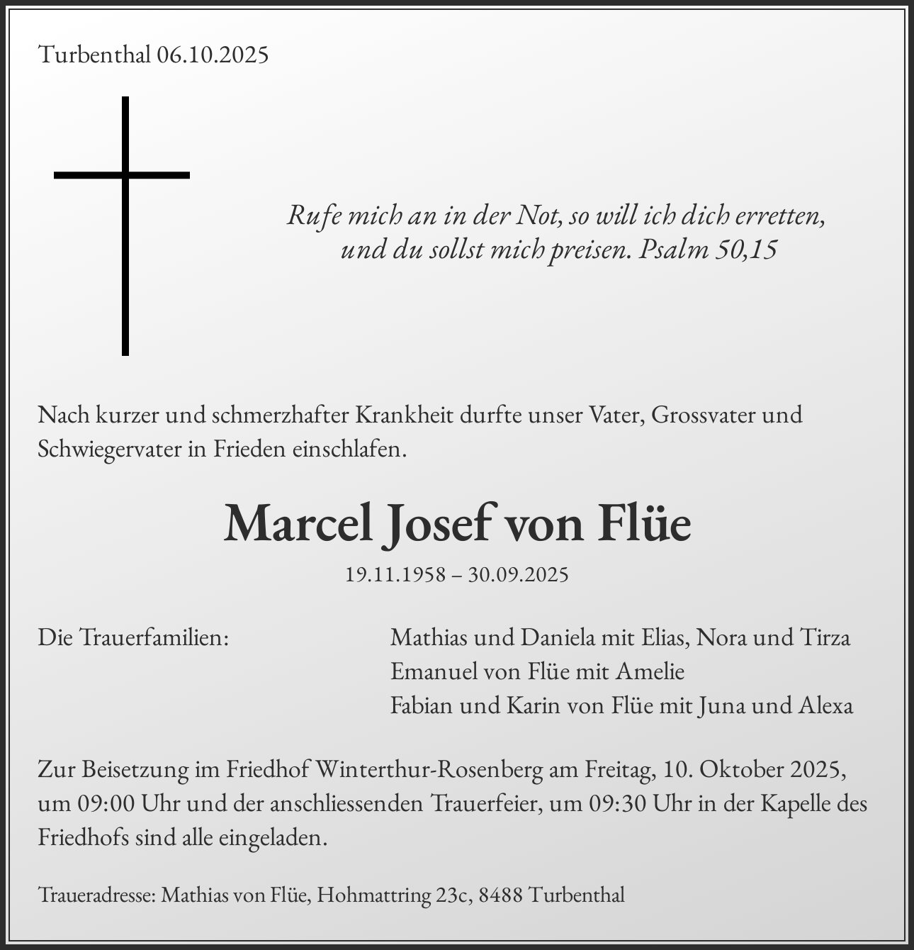 Traueradresse: Mathias von Flüe, Hohmattring 23c, 8488 Turbenthal